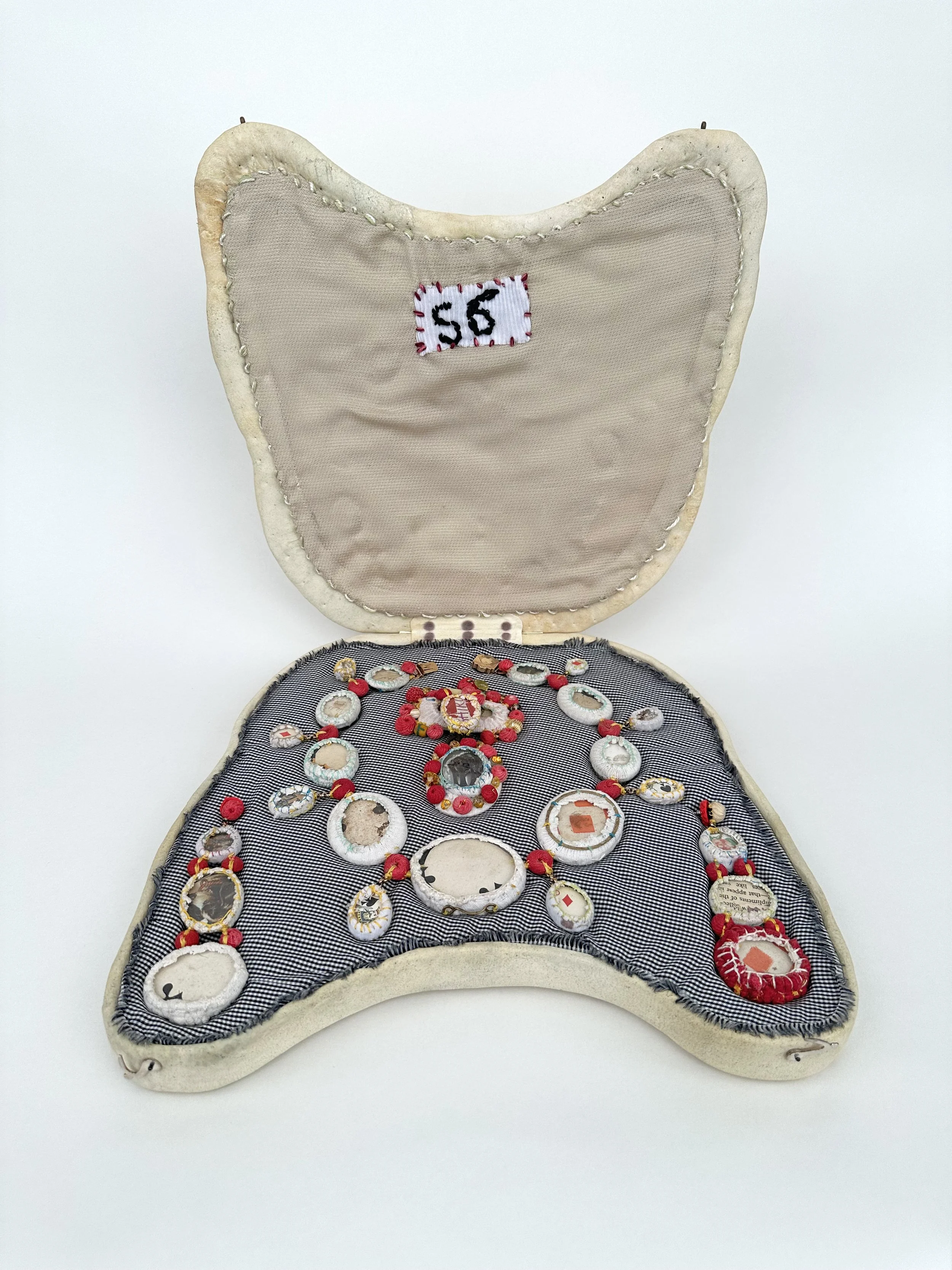 Title: Jewel 56 | Date: 2025 | Dimensions: 12 x 12.5 x 3 in. | Materials: Sheep skin, cotton, linen, acrylic paint, brass, silver, 14 k gold, magic smooth, glass, playing cards, ferrotypes, lithography, paper, citrine, shell and silk floss. | Description: This parure features the guts of historical lockets. These elements always had waste paper within them that is never seen. Many of which are playing cards, fragments of calling cards and other salvage paper. | Signature: EFH (on a sewn on gold tag
